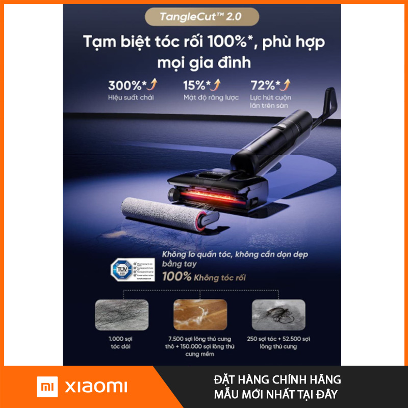 Dreame H15 Pro FoamWash tích hợp hệ thống răng lược chống rối TangleCut™ 2.0 ngay trên đầu hút, giúp tách và cắt tóc rối, lông thú cưng bám vào con lăn trước khi chúng cuốn vào bên trong trục.