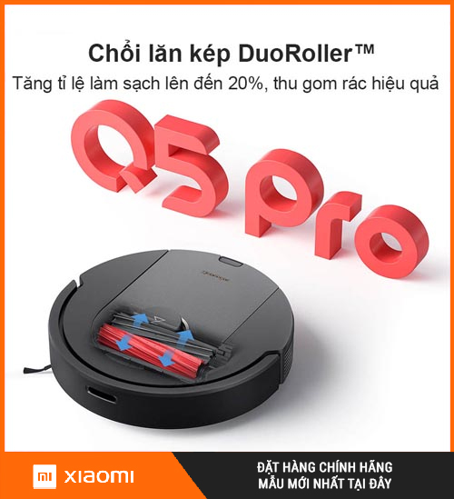 Một trong những điểm nhấn đặc biệt của Roborock Q5 Pro là hệ thống chổi chính kép DuoRoller™. Được thiết kế bằng cao su và hoạt động đồng bộ, hệ thống chổi này giúp robot tăng hiệu suất làm sạch trên thảm cũng như sàn cứng, đồng thời giảm thiểu tình trạng rối tóc – một vấn đề thường gặp khi làm sạch các bề mặt có tóc hoặc lông thú cưng.